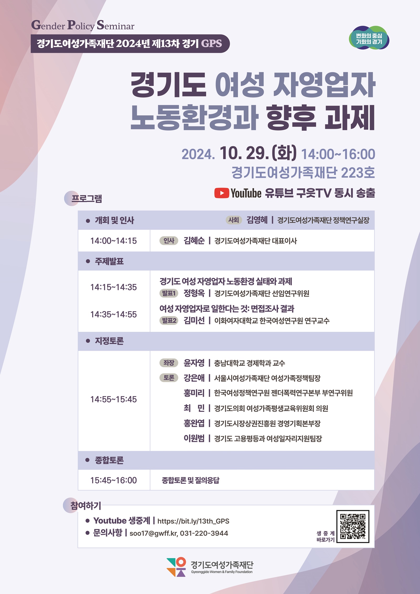 °æ±âµµ¿©¼º°¡Á·Àç´ÜÀº ÀÌ¿Í °°Àº °æ±âµµ ¿©¼º ÀÚ¿µ¾÷ÀÚ ³ëµ¿È¯°æ ½ÇÅÂÁ¶»ç °á°ú¸¦ Åä´ë·Î ÇâÈÄ Á¤Ã¥ ¹æÇâÀ» ³íÀÇÇϱâ À§ÇØ 29ÀÏ Á¦13Â÷ °æ±âGPS(Gender Policy Seminar)¸¦ °³ÃÖÇÑ´Ù.