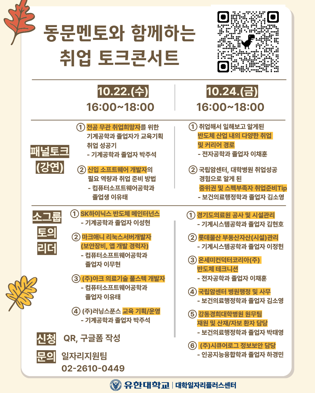 À¯ÇÑ´ëÇб³(ÃÑÀå ÀåÀº¿µ) ÀÏÀÚ¸®Áö¿øÃ³´Â ÀçÇлý, Á¹¾÷»ý, Áö¿ªÃ»³âµéÀÇ ¼º°øÀûÀÎ »çȸ ÁøÃâÀ» µ½±â À§ÇØ ¡®À¯ÇÑ´ëÇб³ µ¿¹® ¸àÅä¿Í ÇÔ²²ÇÏ´Â Ãë¾÷ ÅäÅ©ÄܼƮ¡¯¸¦ ¿À´Â 22Àϰú 24ÀÏ °³ÃÖÇÑ´Ù°í ¹àÇû´Ù.