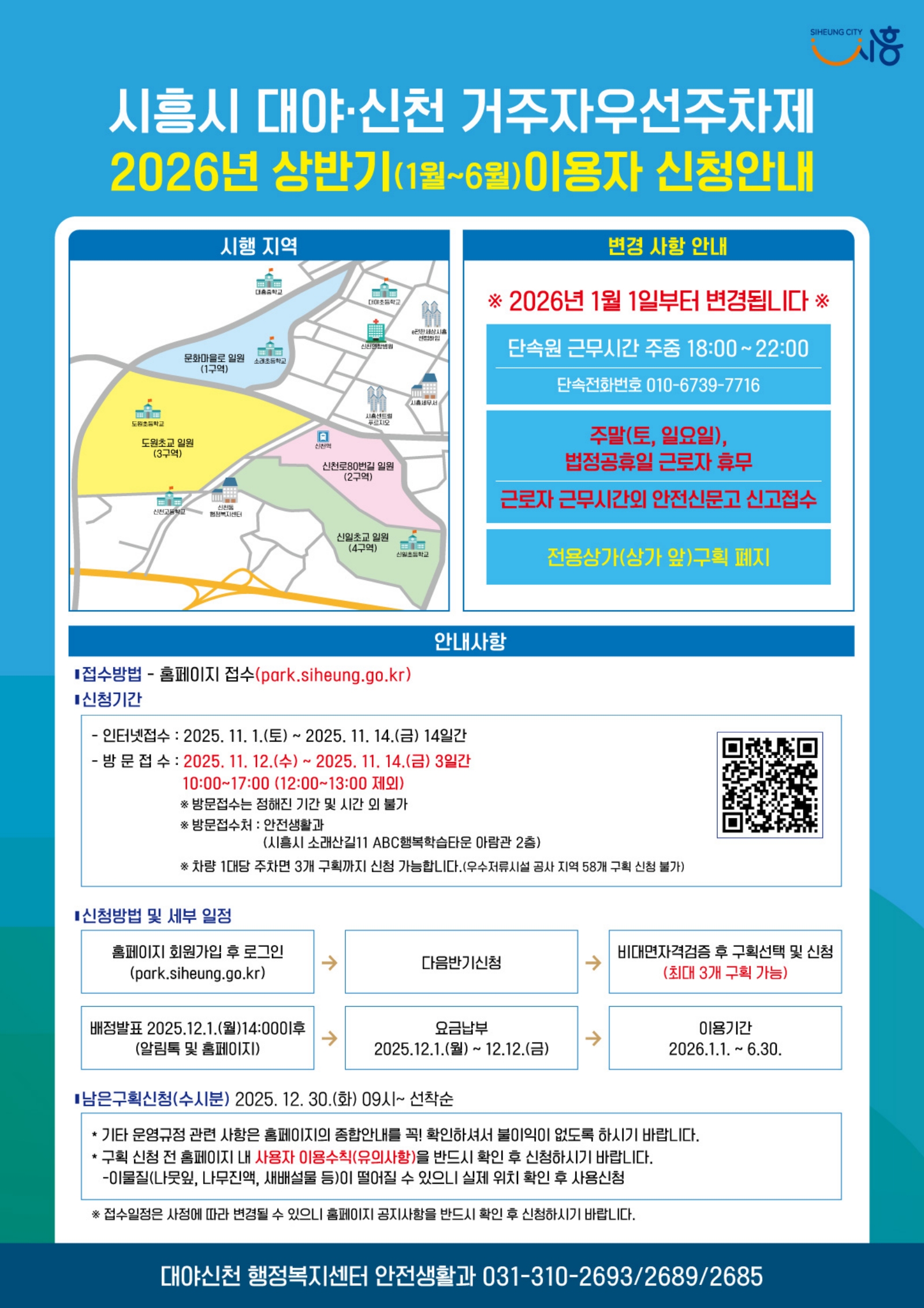 ÀÌ¿ë ½ÅûÀº ÀÎÅͳݰú ¹æ¹® ½Åû µÎ °¡Áö ¹æ½ÄÀ¸·Î ÁøÇàµÈ´Ù. ÀÎÅÍ³Ý ½ÅûÀº 11¿ù 1ÀϺÎÅÍ 11¿ù 14ÀϱîÁö ½ÃÈï½Ã ´ë¾ß¤ý½Åõ °ÅÁÖÀÚ¿ì¼±ÁÖÂ÷ ´©¸®Áý(park.siheung.go.kr)¿¡¼ °¡´ÉÇÏ´Ù. ¹æ¹® ½ÅûÀº 11¿ù 12ÀϺÎÅÍ 14ÀϱîÁö »çÈê°£ ÁøÇàµÇ¸ç, ½ÅûÀ» Èñ¸ÁÇÏ´Â ÁÖ¹ÎÀº ´ë¾ß¤ý½ÅõÇàÁ¤º¹Áö¼¾ÅÍ 1Ãþ ¾ÈÀü»ýȰ°ú¸¦ ¹æ¹®ÇÏ¸é µÈ´Ù. ½Åû ¹× Á¦µµ °ü·Ã ¹®ÀÇ´Â ¾ÈÀü»ýȰ°ú »ýȰ¾ÈÀüÆÀ(031-310-2693, 2689)À¸·Î ÇÏ¸é µÈ´Ù.