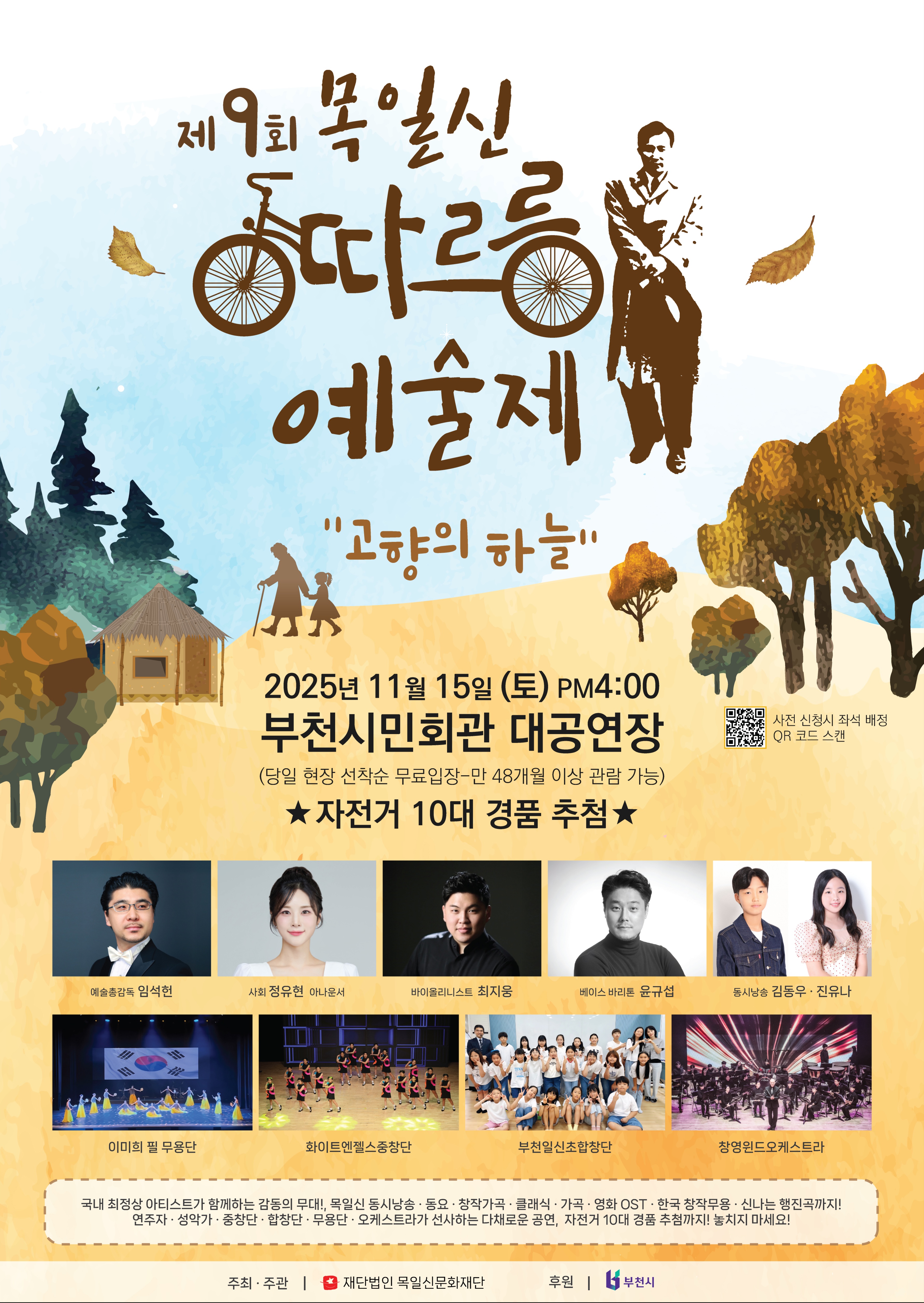 ¡®Á¦9ȸ ¸ñÀϽŵû¸£¸ª¿¹¼úÁ¦¡¯°¡ 2025³â 11¿ù 15ÀÏ(Åä) ¿ÀÈÄ 4½Ã ºÎõ½Ã¹Îȸ°ü ´ë°ø¿¬Àå¿¡¼ °³ÃֵȴÙ.