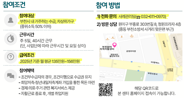 ÀÚȰ±Ù·Î»ç¾÷Àº ÃÖ´ë 5³â±îÁö Âü¿© °¡´ÉÇϸç, 2025³â ±âÁØ ÁÖ 5ÀÏ, 40½Ã°£ ±Ù¹« ½Ã, ¿ùÆò±Õ 135¸¸¿ø~156¸¸¿øÀÇ ±Þ¿©°¡ Áö±ÞµÈ´Ù. ¶ÇÇÑ Âü¿© ÇýÅÃÀ¸·Î ºÐ±âº° ¼º°ú±Ý Áö±Þ, Èñ¸ÁÀúÃà°èÁÂ¥°¡¤¥± ¹× û³â³»ÀÏÀúÃà°èÁ °¡ÀÔÀ» ÅëÇÑ ¸ñµ· ¸¶·Ã ±âȸ Á¦°ø, °æÁ¦¡¤ÀǷᡤÁÖ°Å °ü·Ã º¹Áö¼­ºñ½º Áö¿ø, ÀÚȰ±Ù·Î»ç¾÷ Âü¿© Á¾·á ÈÄ °³º° Ãë¾÷ Áö¿ø µîÀÌ Á¦°øµÈ´Ù.