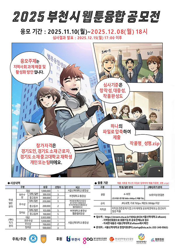 ºÎõ½Ã´Â 11¿ù 10ÀϺÎÅÍ 12¿ù 8ÀϱîÁö ¼¿ï½ÅÇдëÇб³ ¡®ÀÌ·ë(eRoom)¡¯ Ç÷§ÆûÀ» ÅëÇØ Áö¿ª À¥Å÷ âÀÛ »ýŰ踦 Á¶¼ºÇϰí Â÷¼¼´ë âÀÇÀÎÀ縦 ¹ß±¼Çϱâ À§ÇÑ ¡®2025 ºÎõ½Ã À¥Å÷À¶ÇÕ°ø¸ðÀü¡¯À» °³ÃÖÇÑ´Ù.