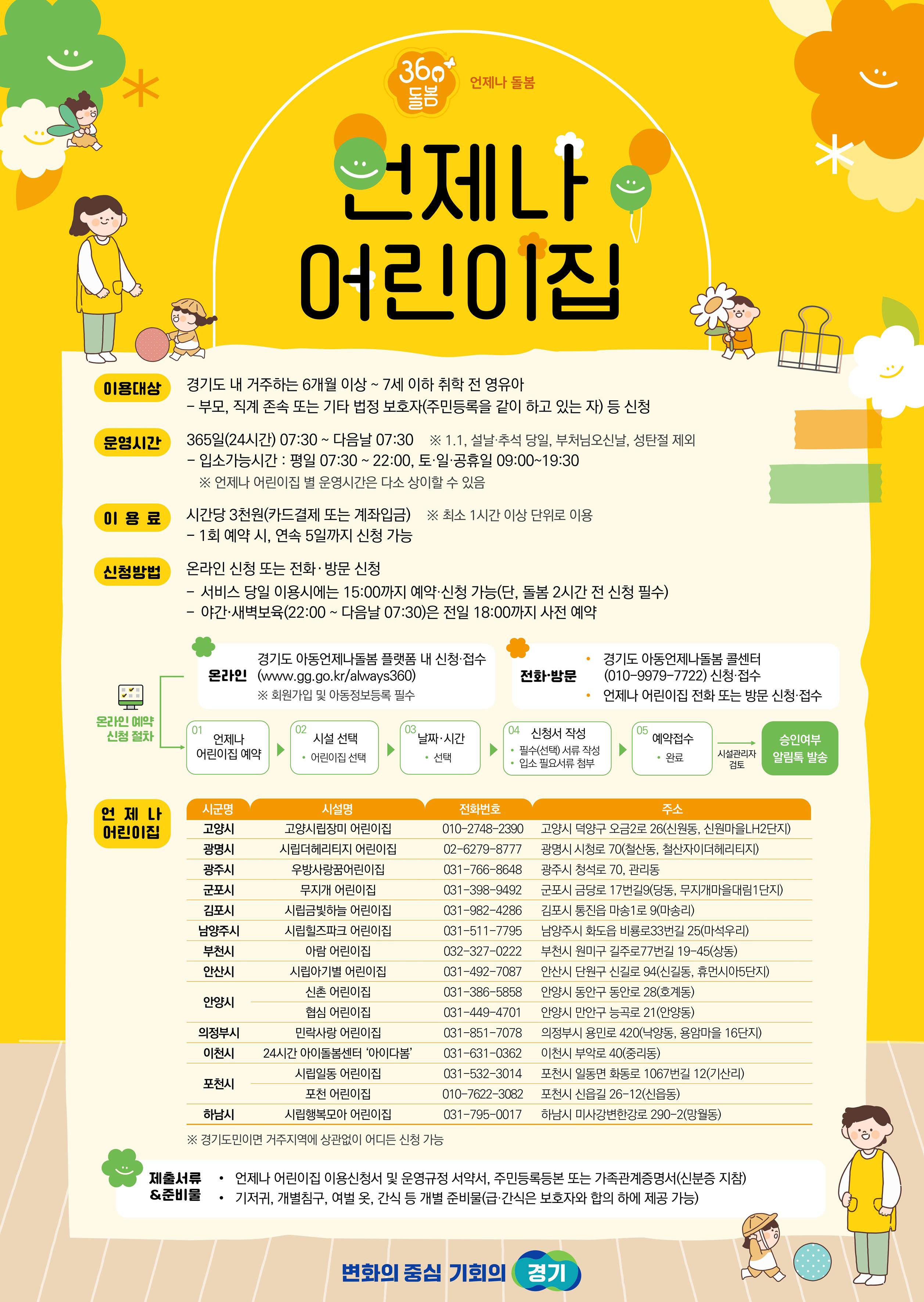 3¿ù ÇöÀç µµ³» 13°³ ½Ã±º 15°³¼Ò¸¦ ¿î¿µ ÁßÀÎ ¡®¾ðÁ¦³ª ¾î¸°ÀÌÁý¡¯Àº 365ÀÏ 24½Ã°£ ¿î¿µµÇ´Â ±ä±Þ¡¤ÀϽà º¸À° ¼ºñ½º¸¦ Á¦°øÇÏ´Â ½Ã¼³ÀÌ´Ù. °æ±âµµ¿¡ °ÅÁÖÇÏ´Â ¿µÀ¯¾Æ(6°³¿ù ÀÌ»ó 7¼¼ ÀÌÇÏ ÃëÇÐ Àü)¸¦ µÐ º¸È£ÀÚ¶ó¸é °¡Á¤¿¡¼ Àڳฦ ¾çÀ°ÇÏ´õ¶óµµ, ¾î¸°ÀÌÁýÀ̳ª À¯Ä¡¿øÀ» ´Ù´Ï´õ¶óµµ, ¡®¾ðÁ¦³ª ¾î¸°ÀÌÁý¡¯°ú °ÅÁÖÁö¿ªÀÌ ´Þ¶óµµ Á¦ÇÑ ¾øÀÌ ´©±¸³ª ÀÌ¿ëÇÒ ¼ö ÀÖ´Ù.